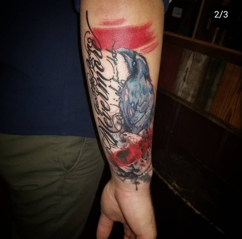 It was done unprofessionally, all the wrong ways, by my friend. My favorite band at the time was Slipknot, so I got their logo tattooed on my arm. It ended up looking tribal over time, so I covered it up.